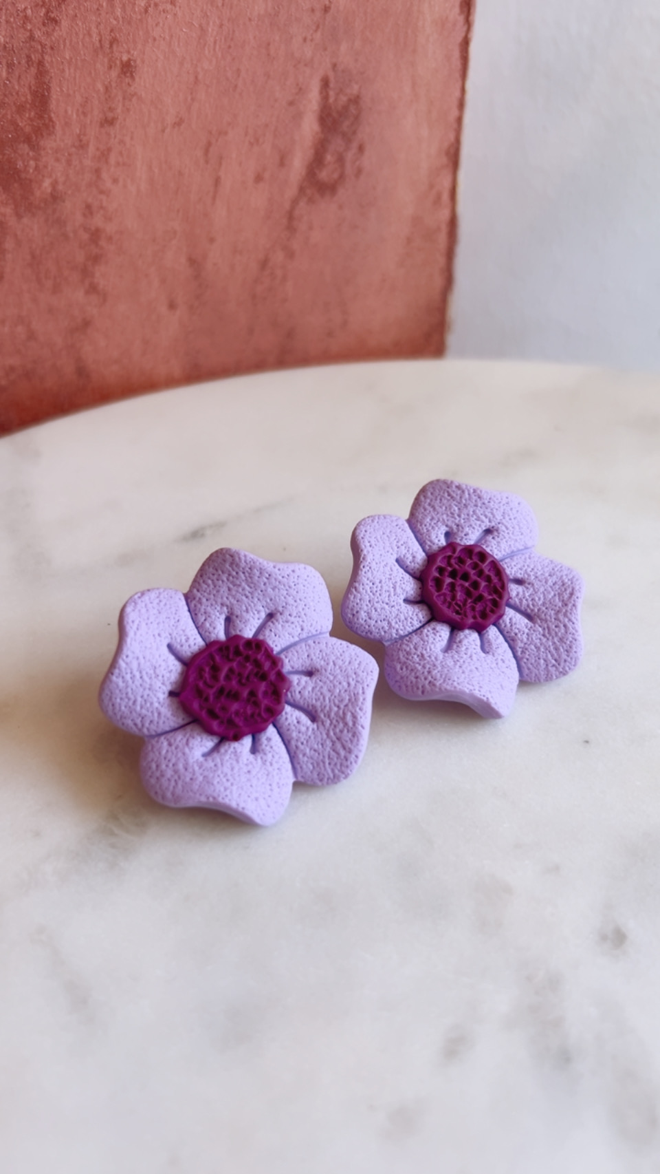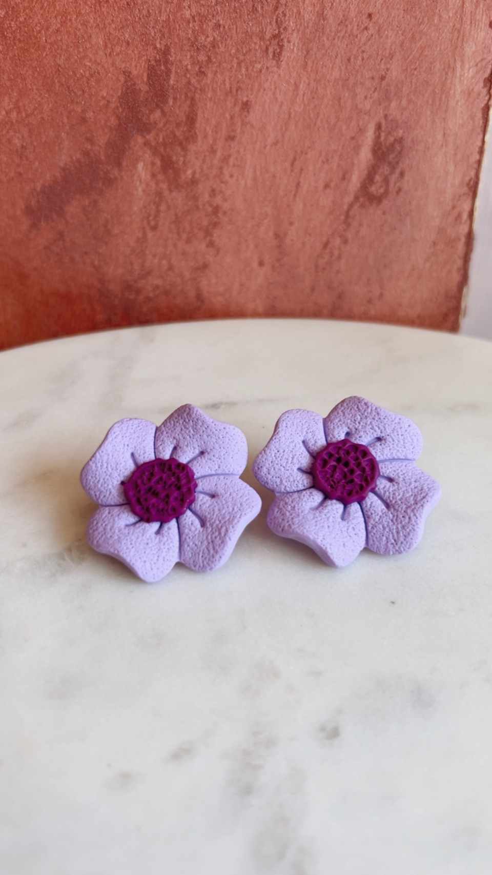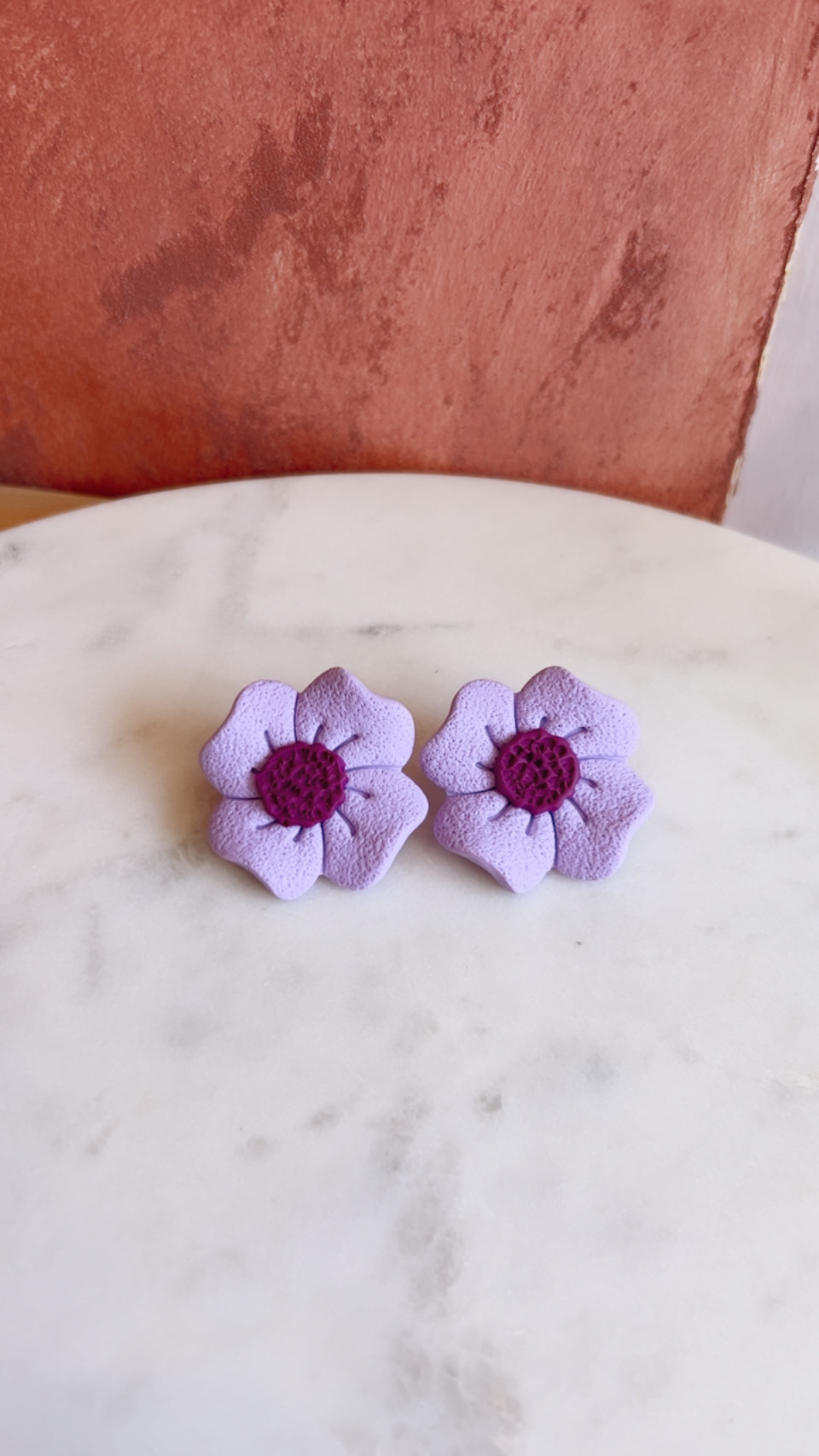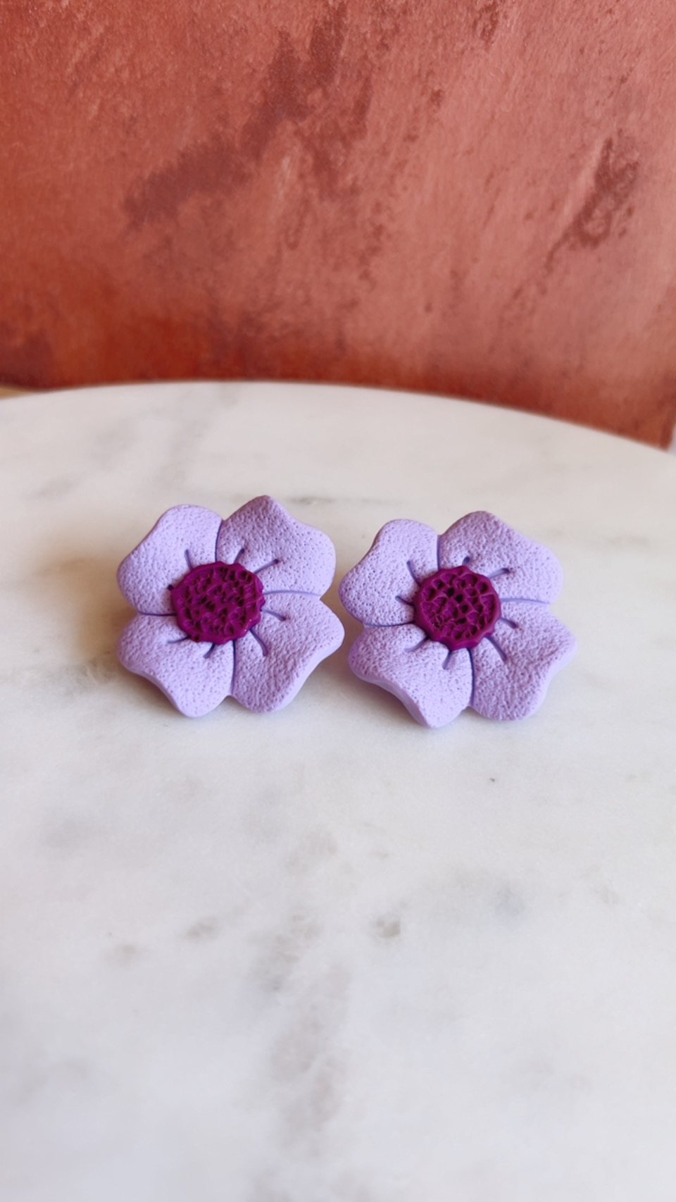 Χειροποίητα σκουλαρίκια από πηλό σε σχήμα λουλουδιού, σε λιλά ματ απόχρωση με μωβ κέντρο.
