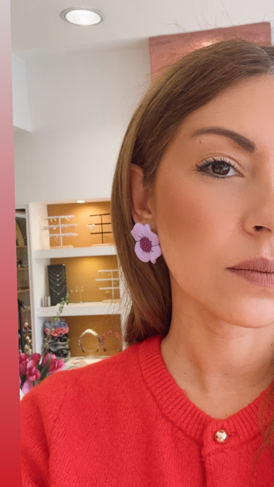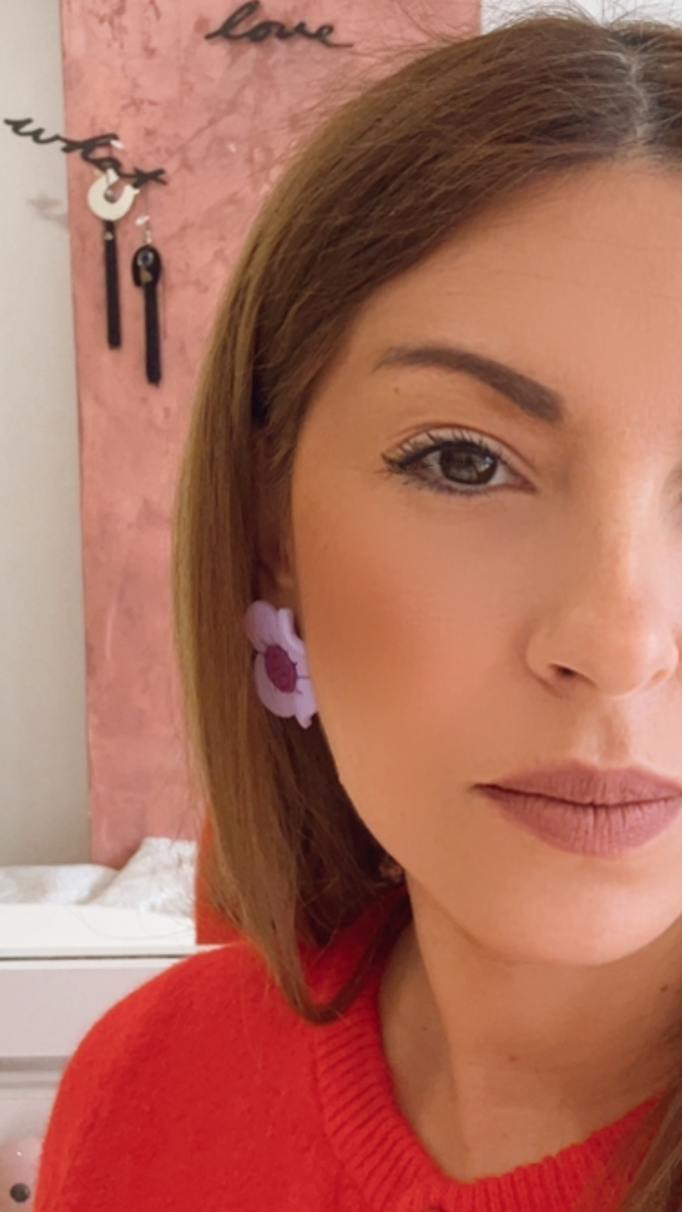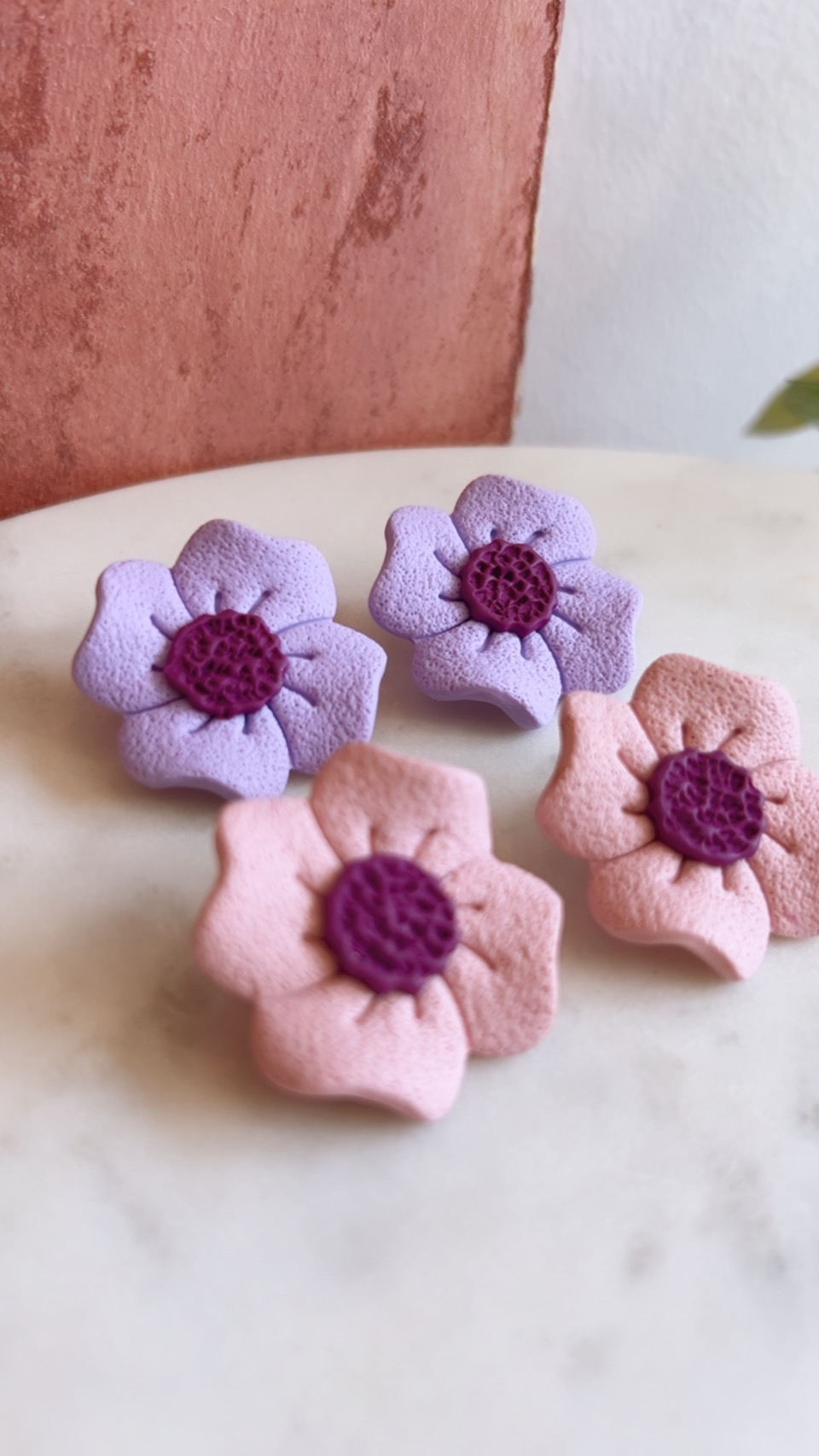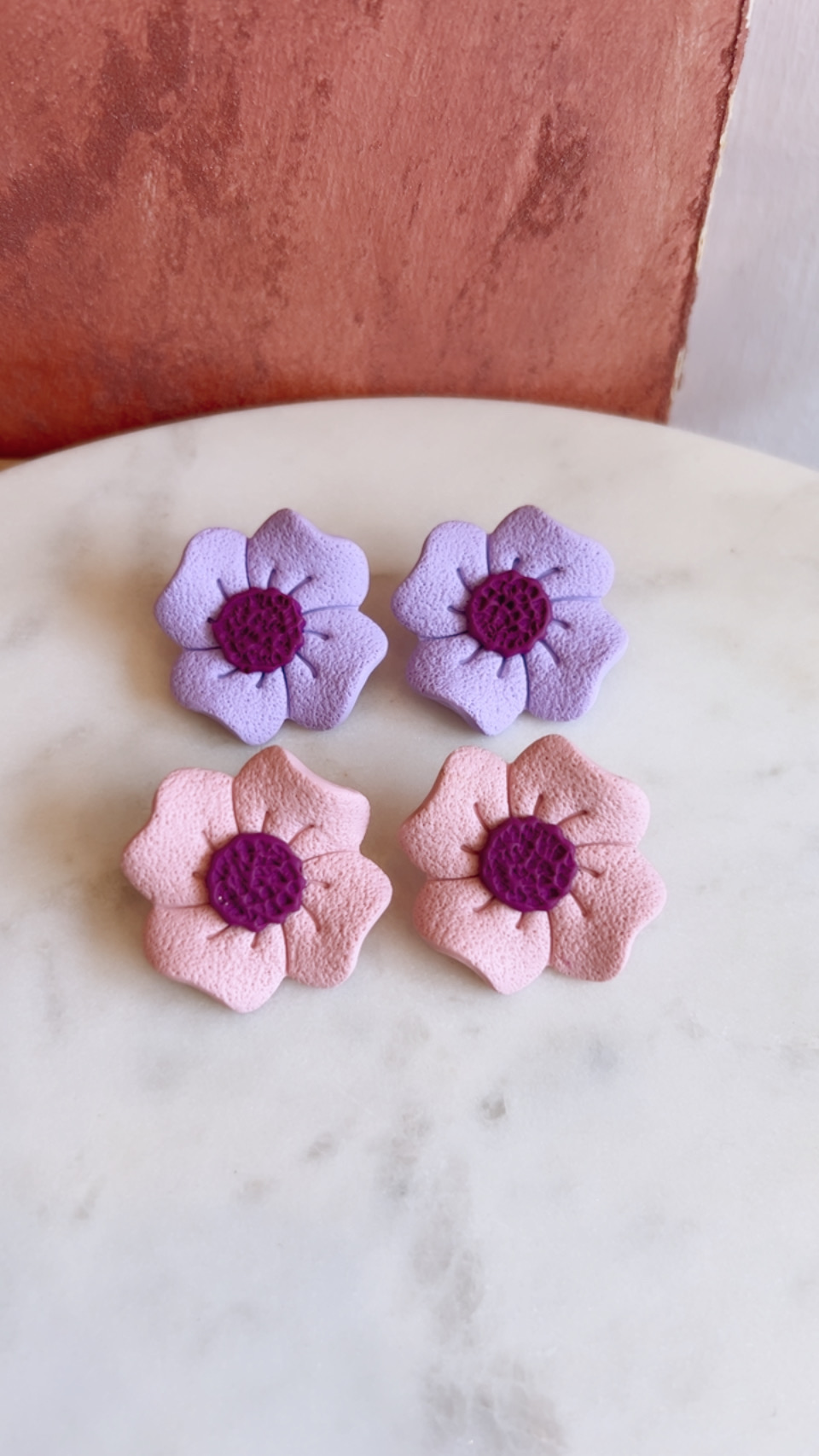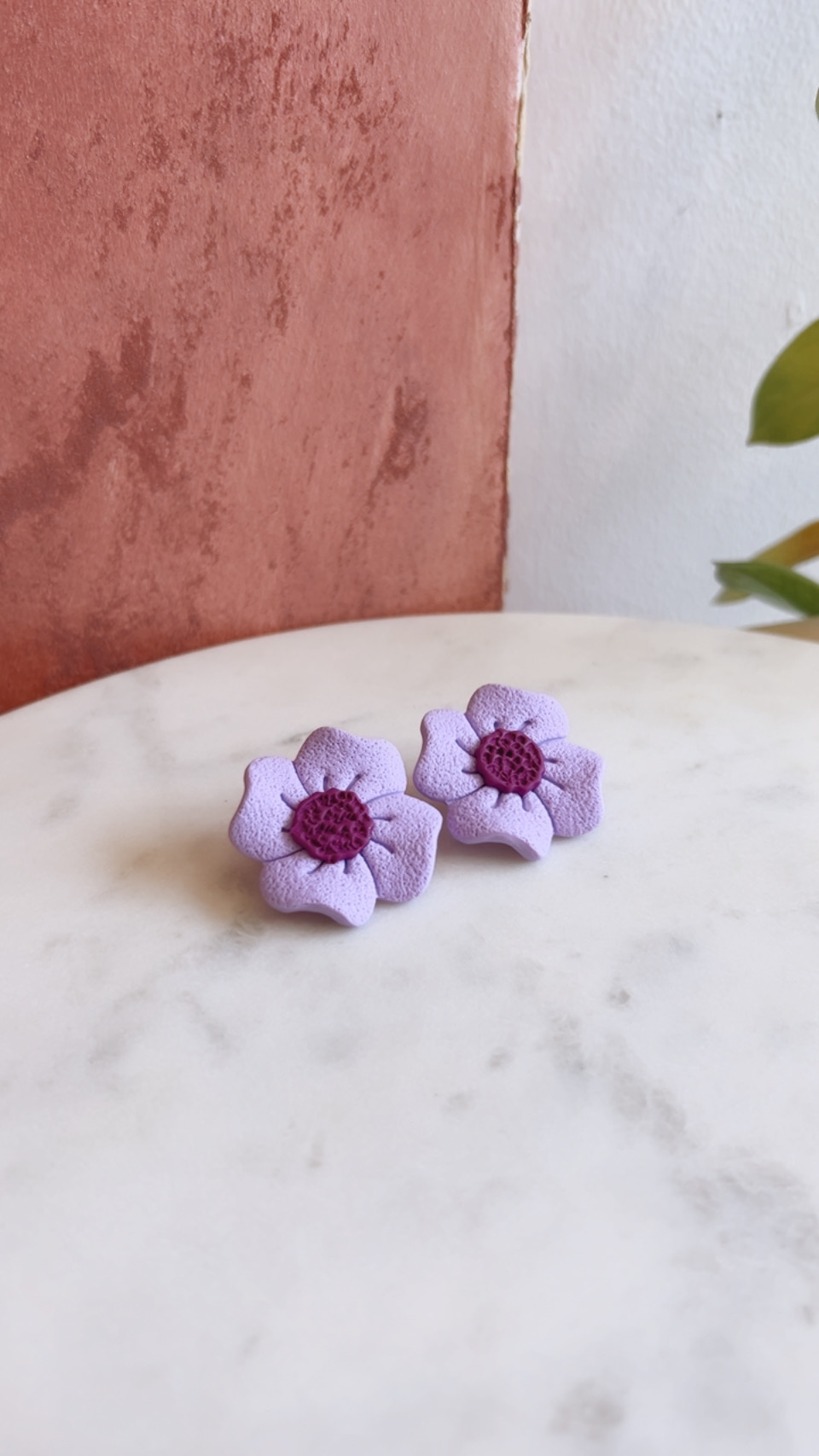 Χειροποίητα σκουλαρίκια από πηλό σε σχήμα λουλουδιού, σε λιλά ματ απόχρωση με μωβ κέντρο.