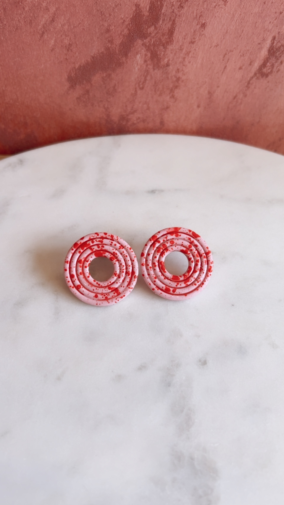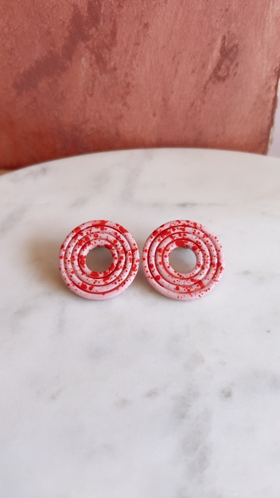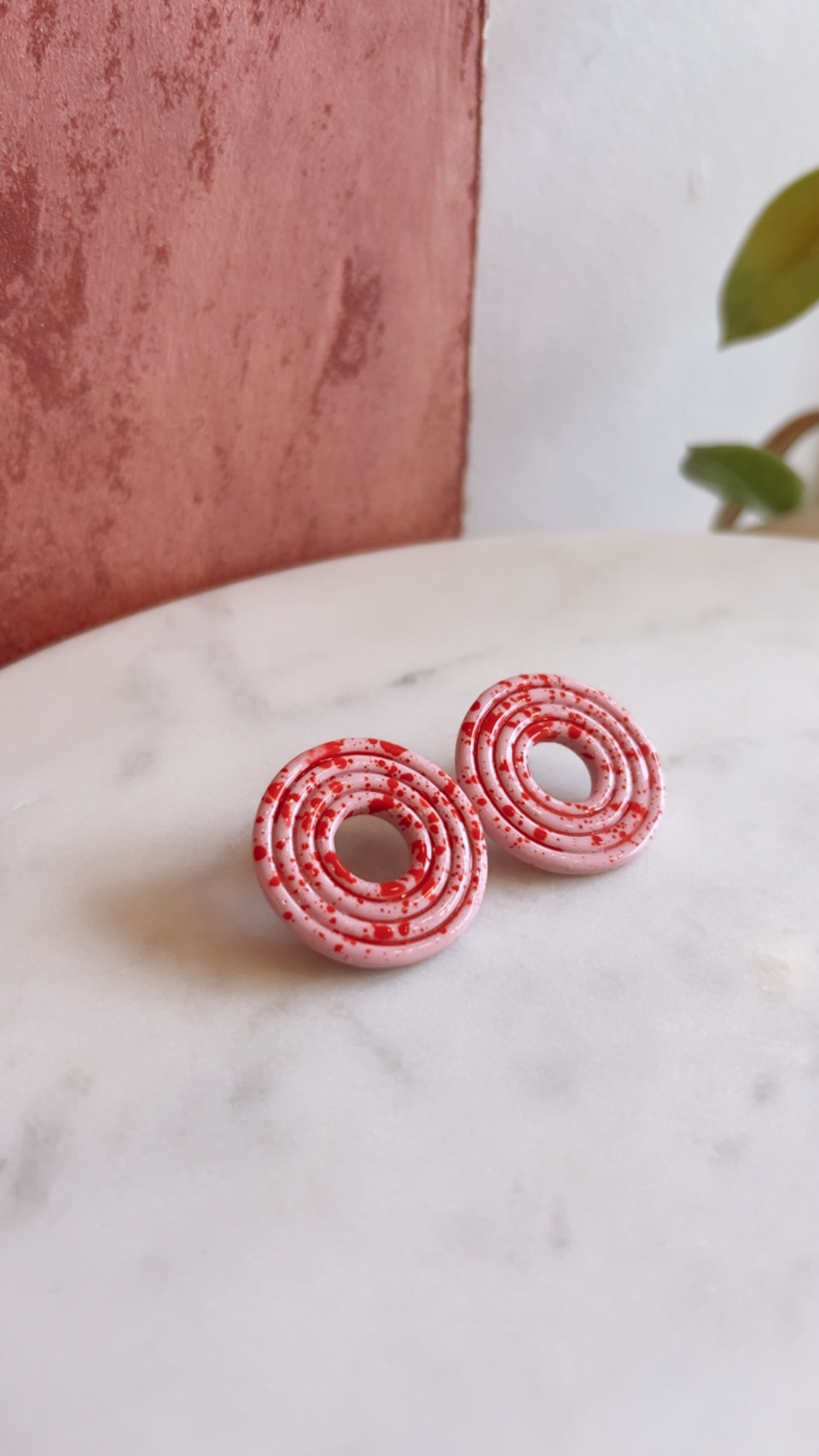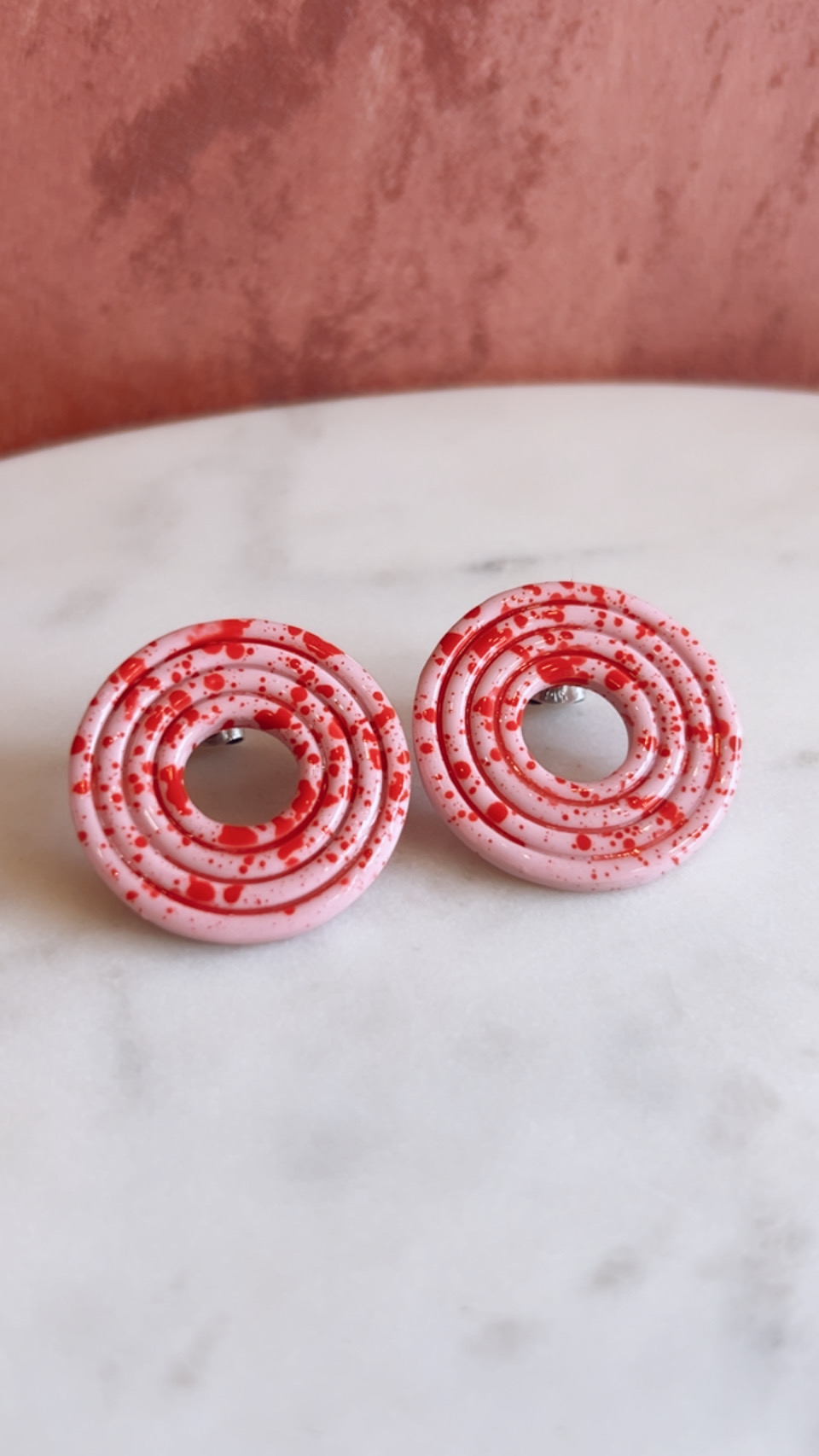 Χειροποίητα σκουλαρίκια από πολυμερισμένο πηλό σε ροζ απόχρωση με κόκκινες πιτσιλιές, που δημιουργούν ένα παιχνιδιάρικο και μοντέρνο αποτέλεσμα. Το ιδιαίτερο κυκλικό τους σχέδιο προσθέτει στυλ και χαρακτήρα σε κάθε εμφάνιση.
