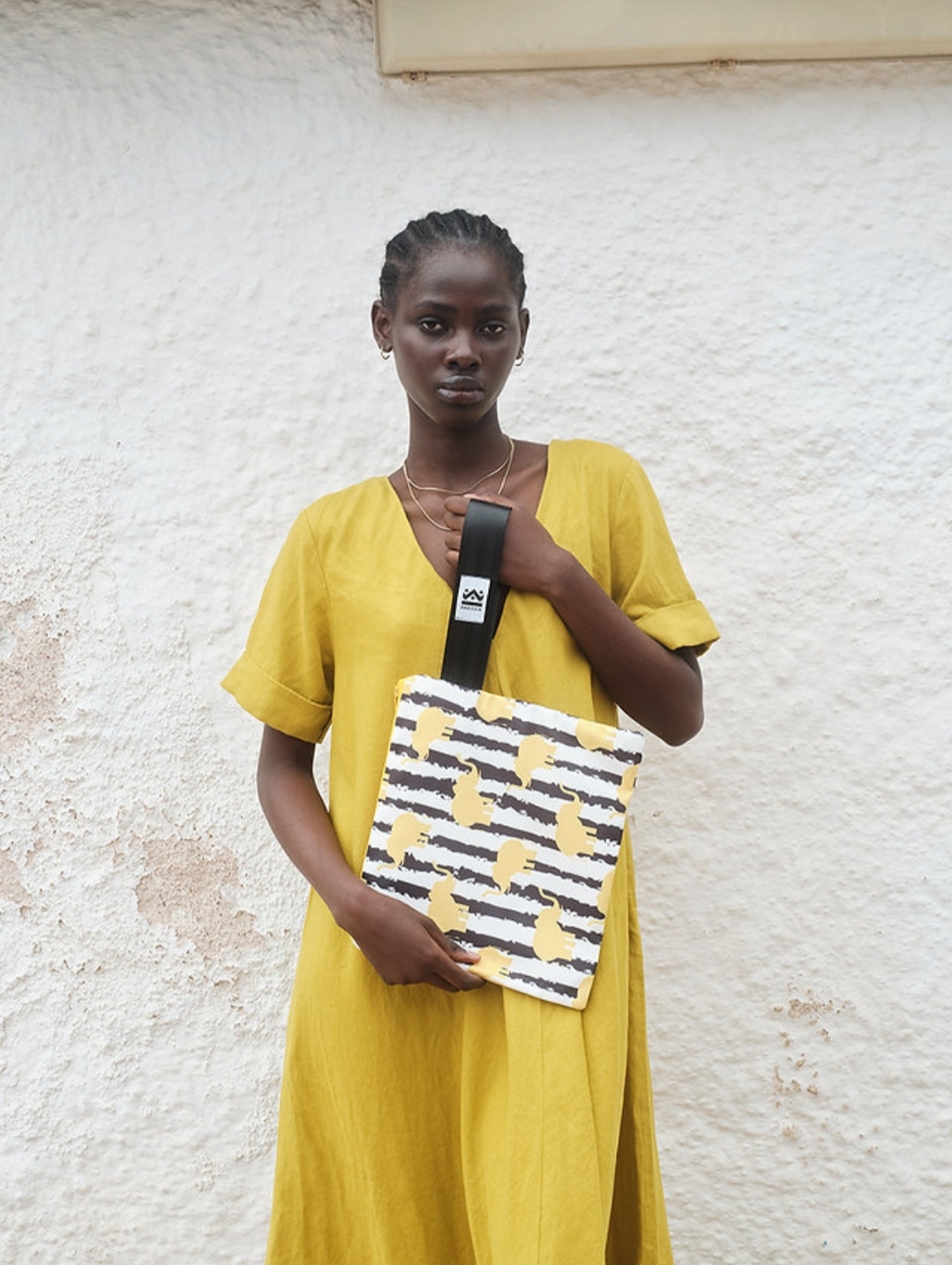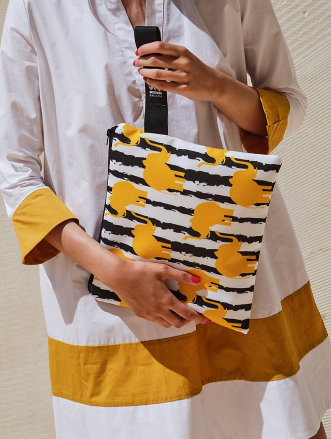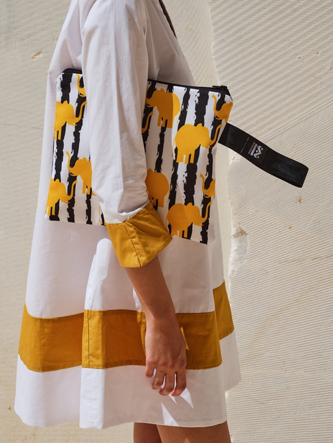 Κίτρινες φιγούρες ελεφάντων διάσπαρτες σε ασπρόμαυρο φόντο, δίνουν μια παιχνιδιάρικη διάθεση σε αυτό το χαρούμενα κομψό χειροποίητο τσαντάκι για το χέρι σου!